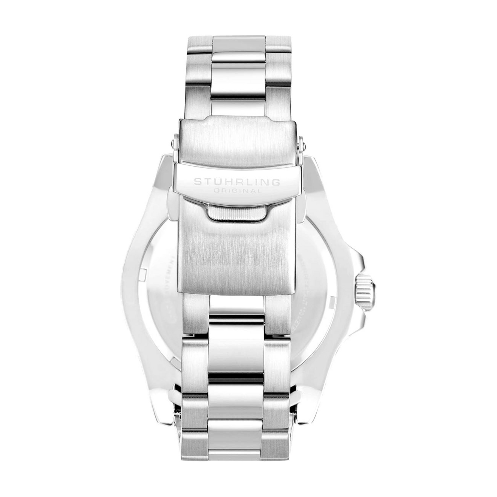 - Fully adjustable three-row stainless steel link bracelet with push button deployment clasp.
